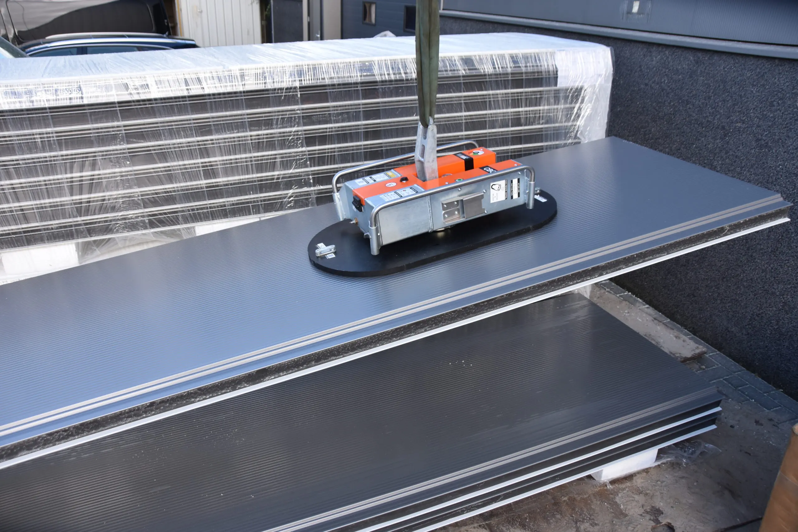CladBoy compact no solo puede elevar de forma rápida y sencilla paneles de fachada, sino también buhardillas. Para ello, el elevador por vacío se adhiere directamente a la estructura de cubierta plana de forma que las buhardillas prefabricadas se puedan elevar hasta el tejado en una pieza. Por lo tanto, no es necesario fijar puntos de elevación aparte ni colocar eslingas de elevación.